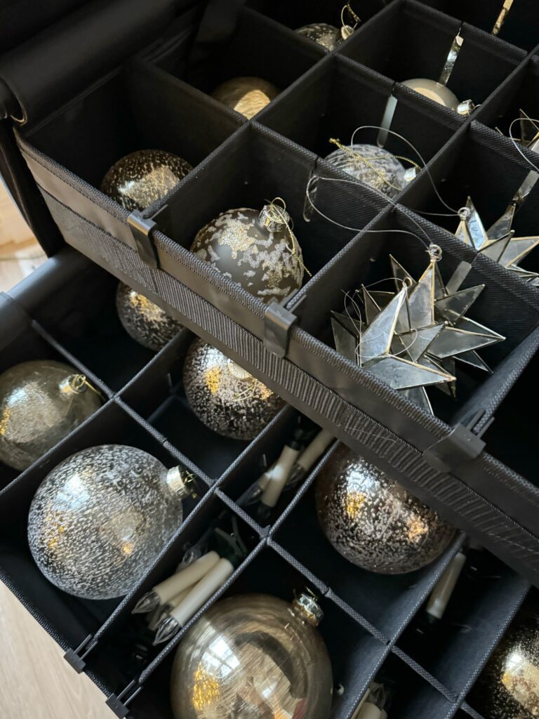 Tada! The ornaments are all organized and safe! I love how roomy each spot is, you can add more if you have a lot of them.