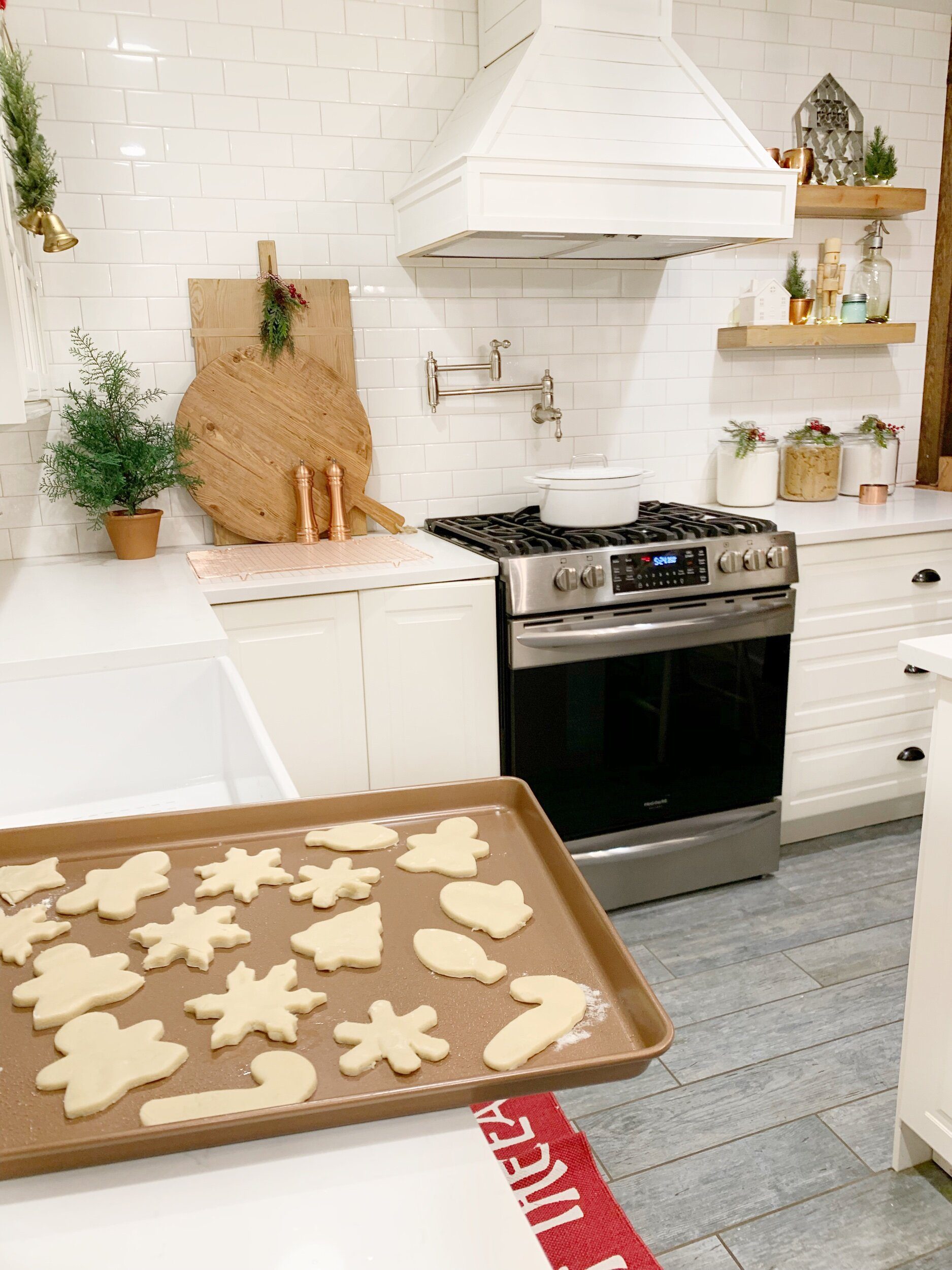 I really loved using this Wilton copper cookie sheet and the cooling grid, the sheet is just the perfect size and holds so much I need to add more to my list! Even the Merry Christmas oven mitts are from JOANN.