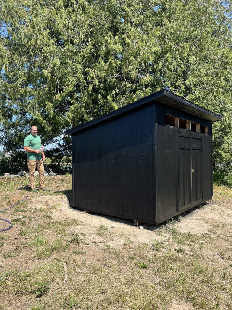 Here is James painting the shed! We used our favorite black paint – Behr Limousine Leather.