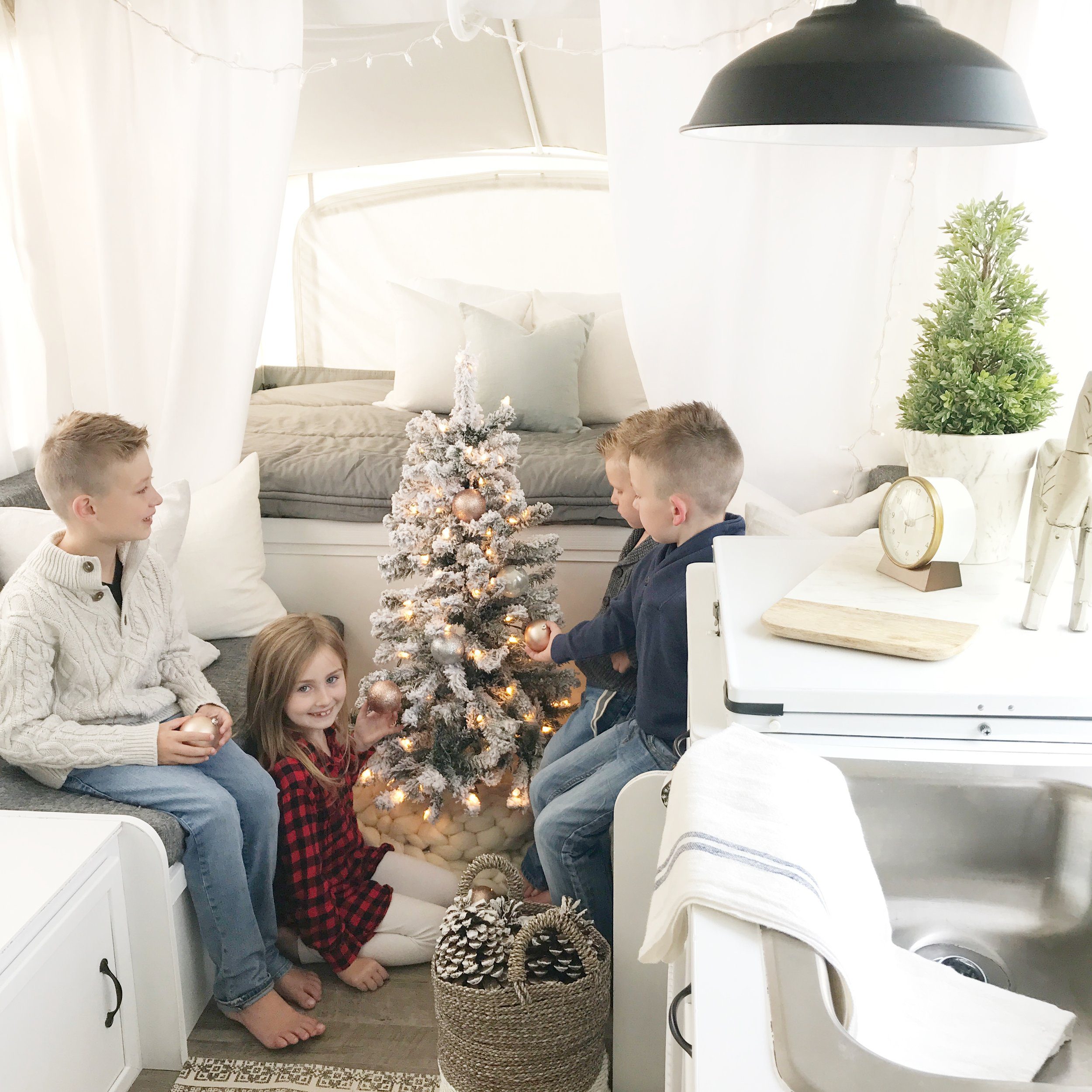 We take decorating serious around here, even in our camper! The kids had so much fun decorating the tree, putting lights up and goofing off for these photos! Our camper has gotten so much love, and while we dont use it in the winter we count down the days! Hopefully these photos will inspire you that you can decorate any space no matter how big or small. Make sure to read down to the end for a fun twist on when we took these photos… it goes to show social media isnt always what it seems!