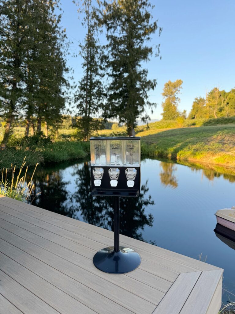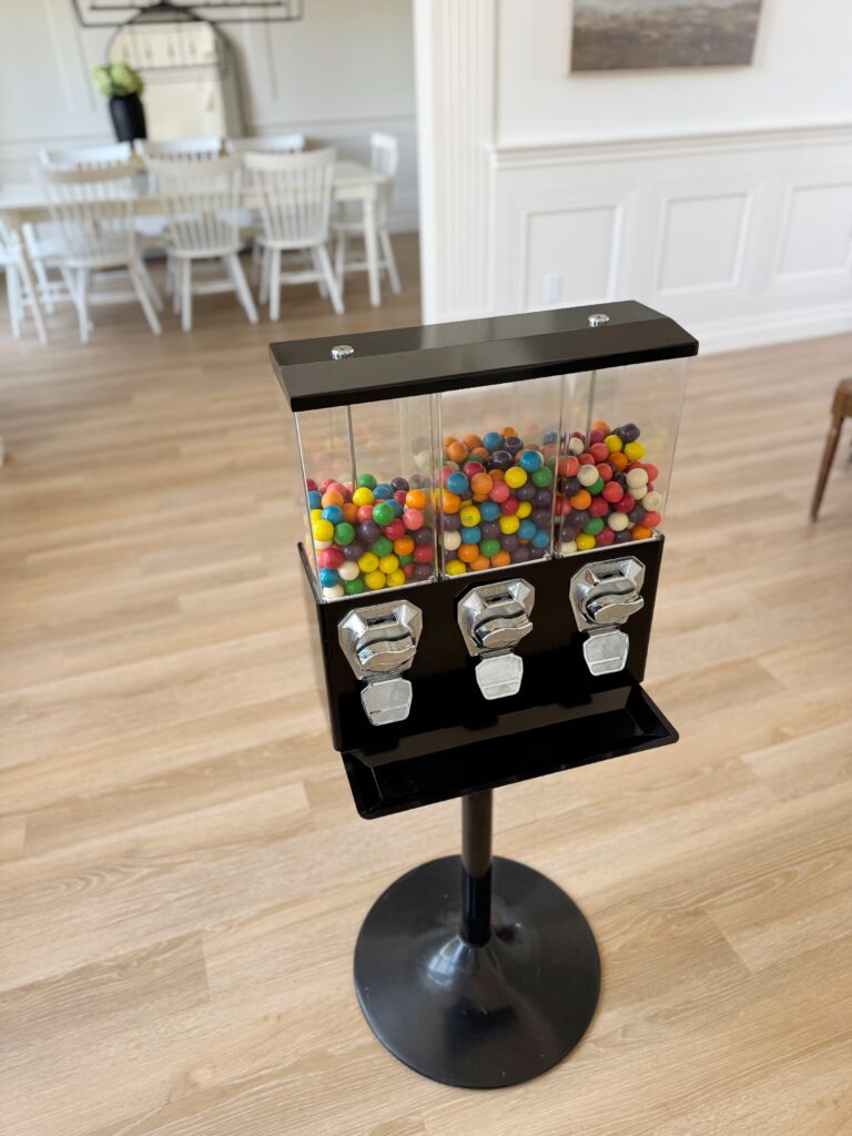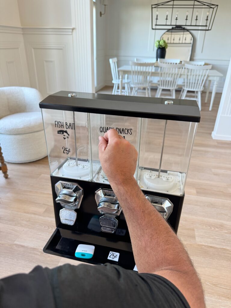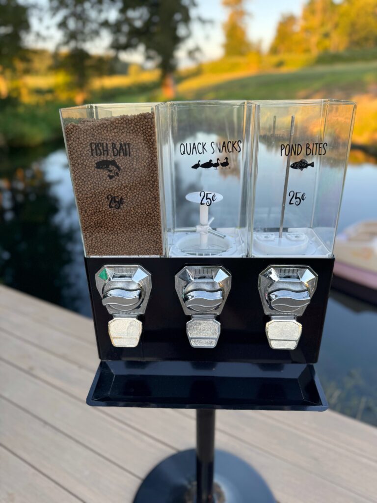 Ollie has been asking for a fun machine to hold his fish food, and I found this one and knew it was just what we needed! He has fish that like different food – yes they are picky! Then we have some ducks that find their way in so having the three slot gumball machine was perfect for a fish food vending machine!