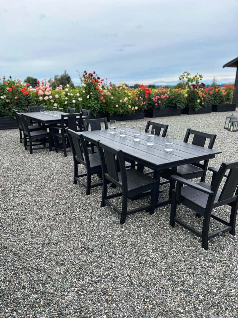 While the POLYWOOD Prairie Table and chairs are the star of the show, these dahlias are quite the beauty!