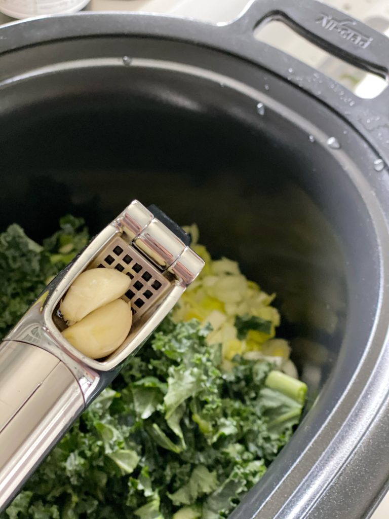 - Take your leeks, garlic, onion, and kale cook stirring 3-4 minutes until soft.