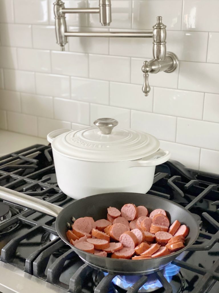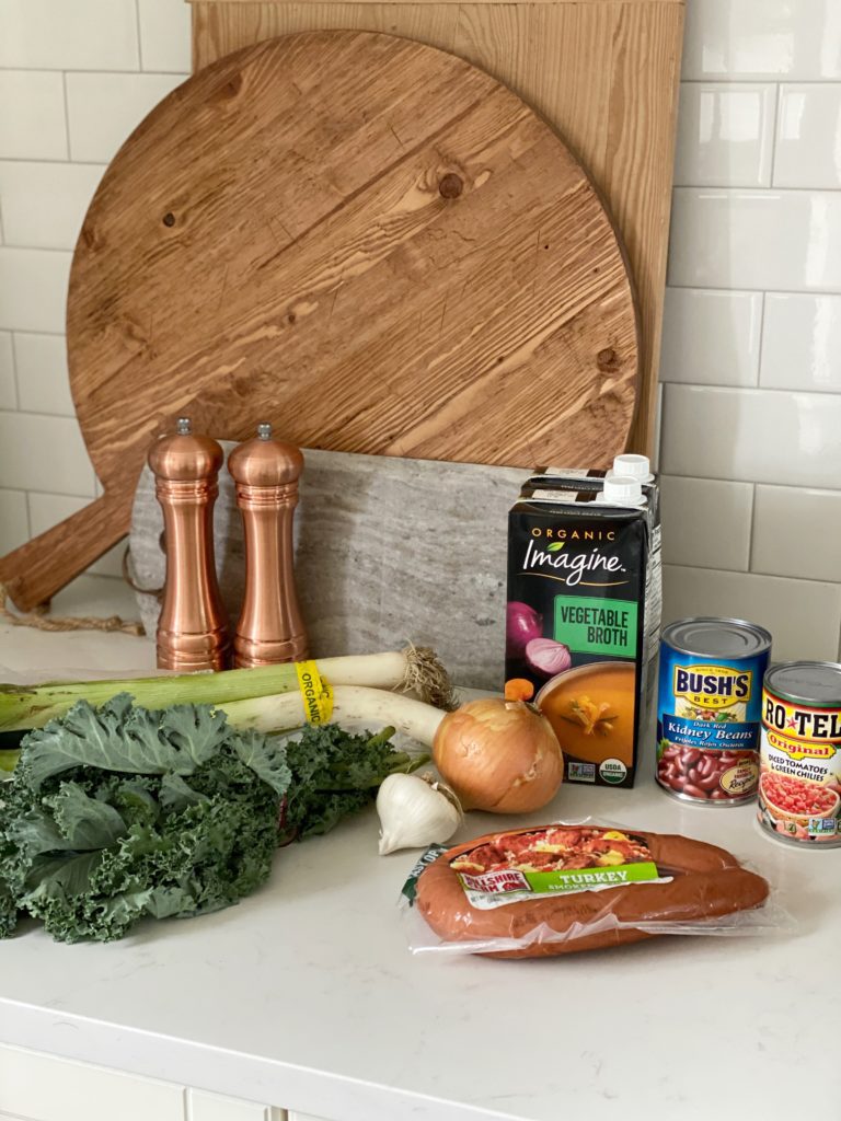 - Prepare your leeks, kale, onion, garlic, kidney beans and kielbasa.