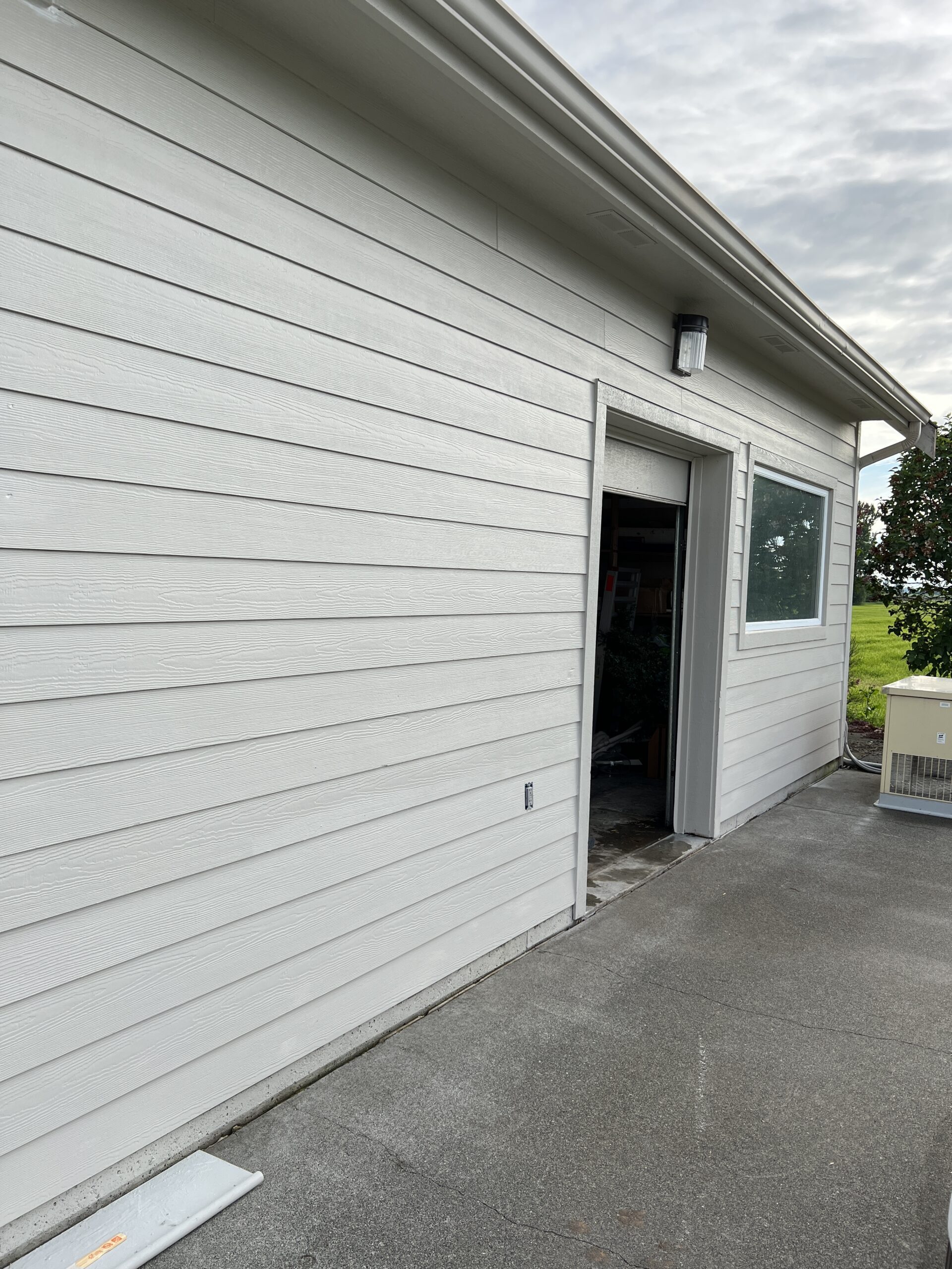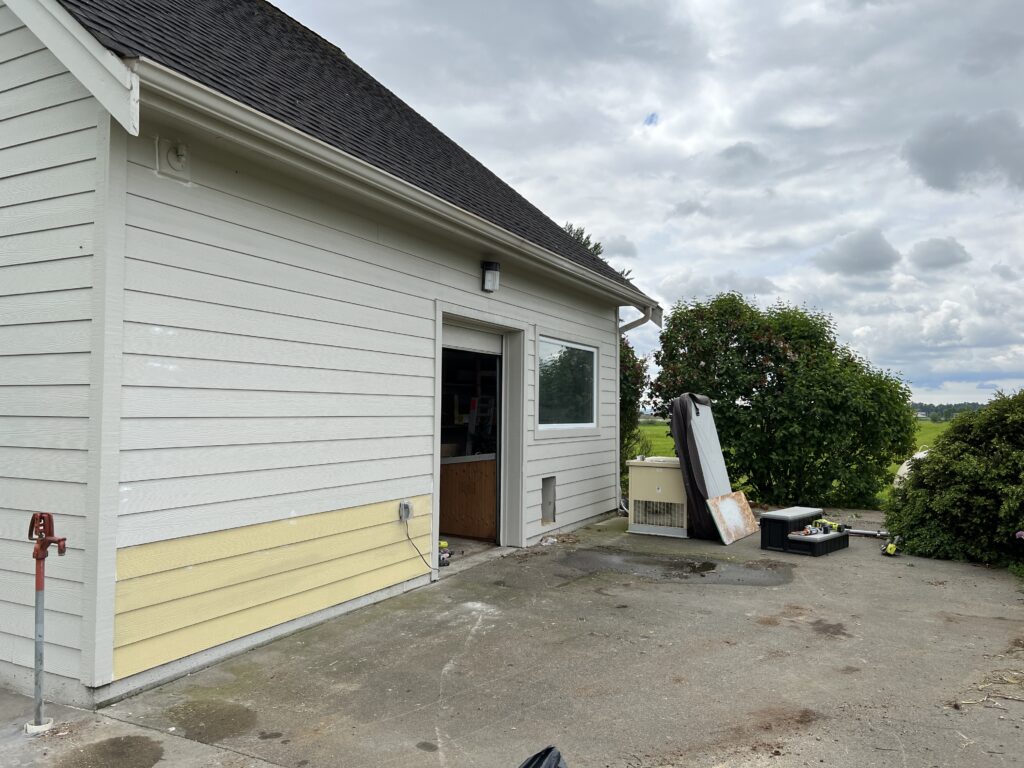 We took out the boxes behind the holes, added in some supports and then attached the hardie board. We used all new pieces and then it was time for a fresh coat of paint. If you noticed James added some electrical for the hot tub, and then switched out the light. ( Always best to check with an electrician)
