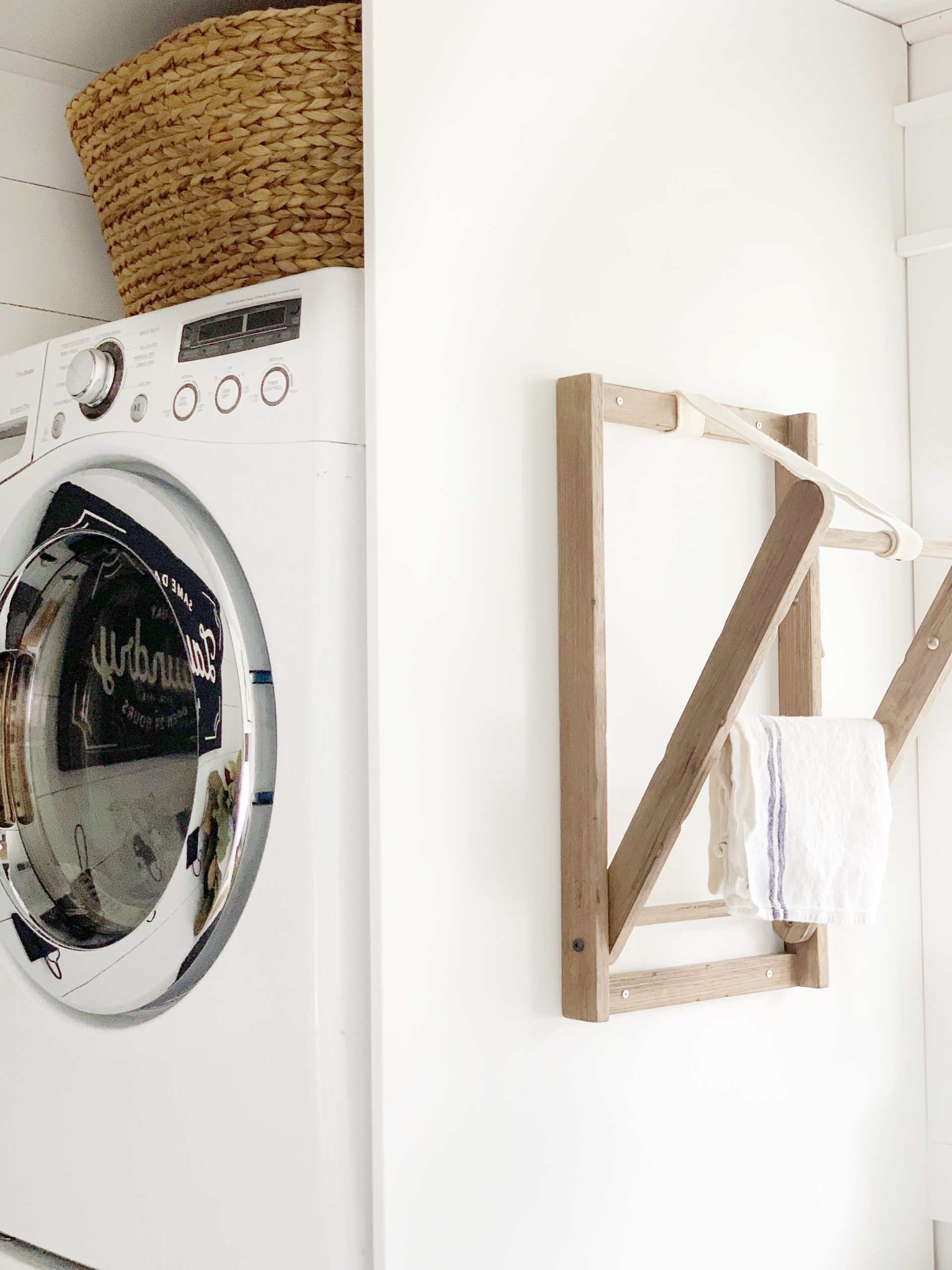 When I was planning for a laundry room remodel, I found this little drying rack and knew I had to find a spot for it, and this big blank space was perfect. What better than to let wet towels and clothing drip in the Elkay farmhouse sink?