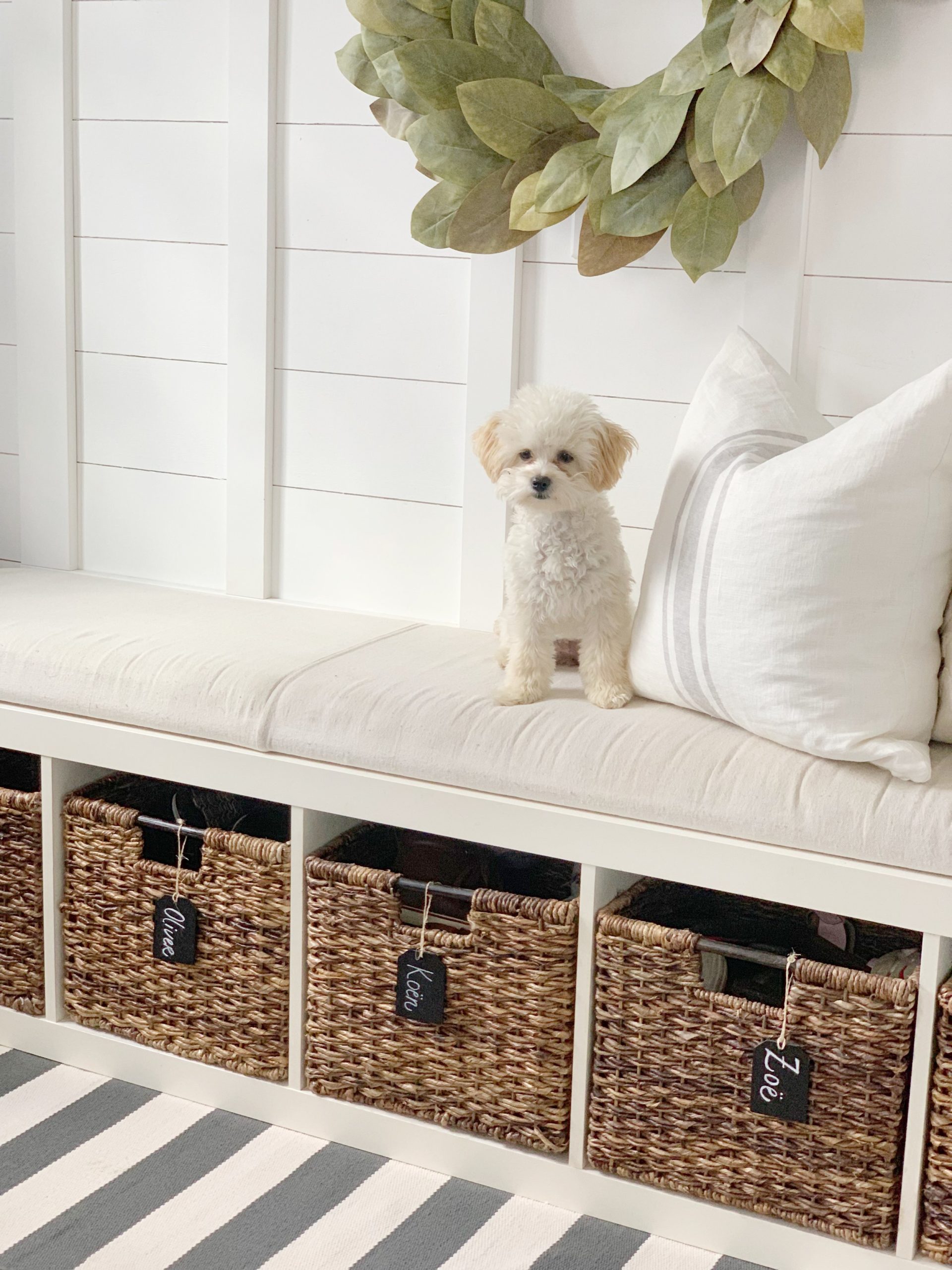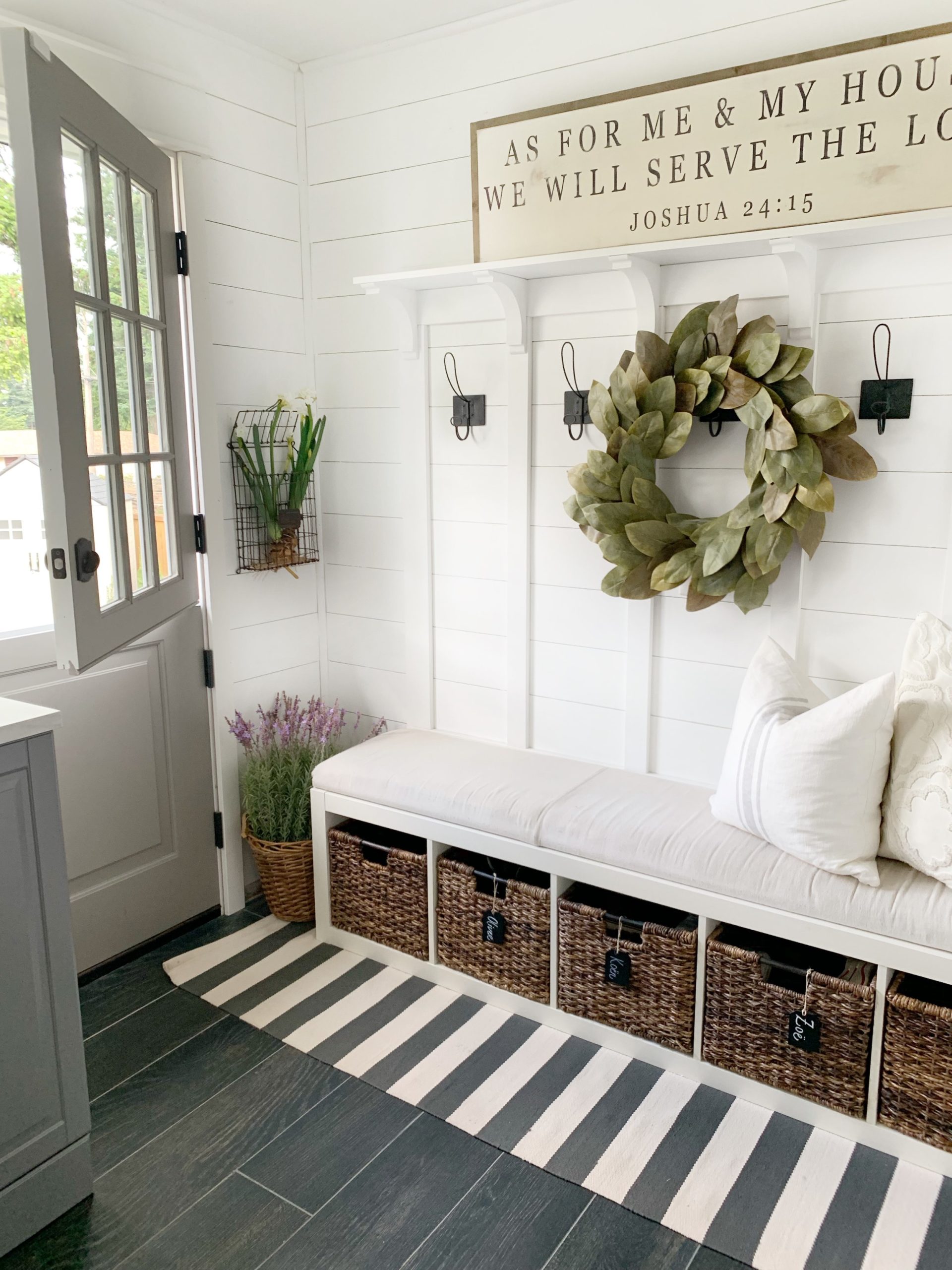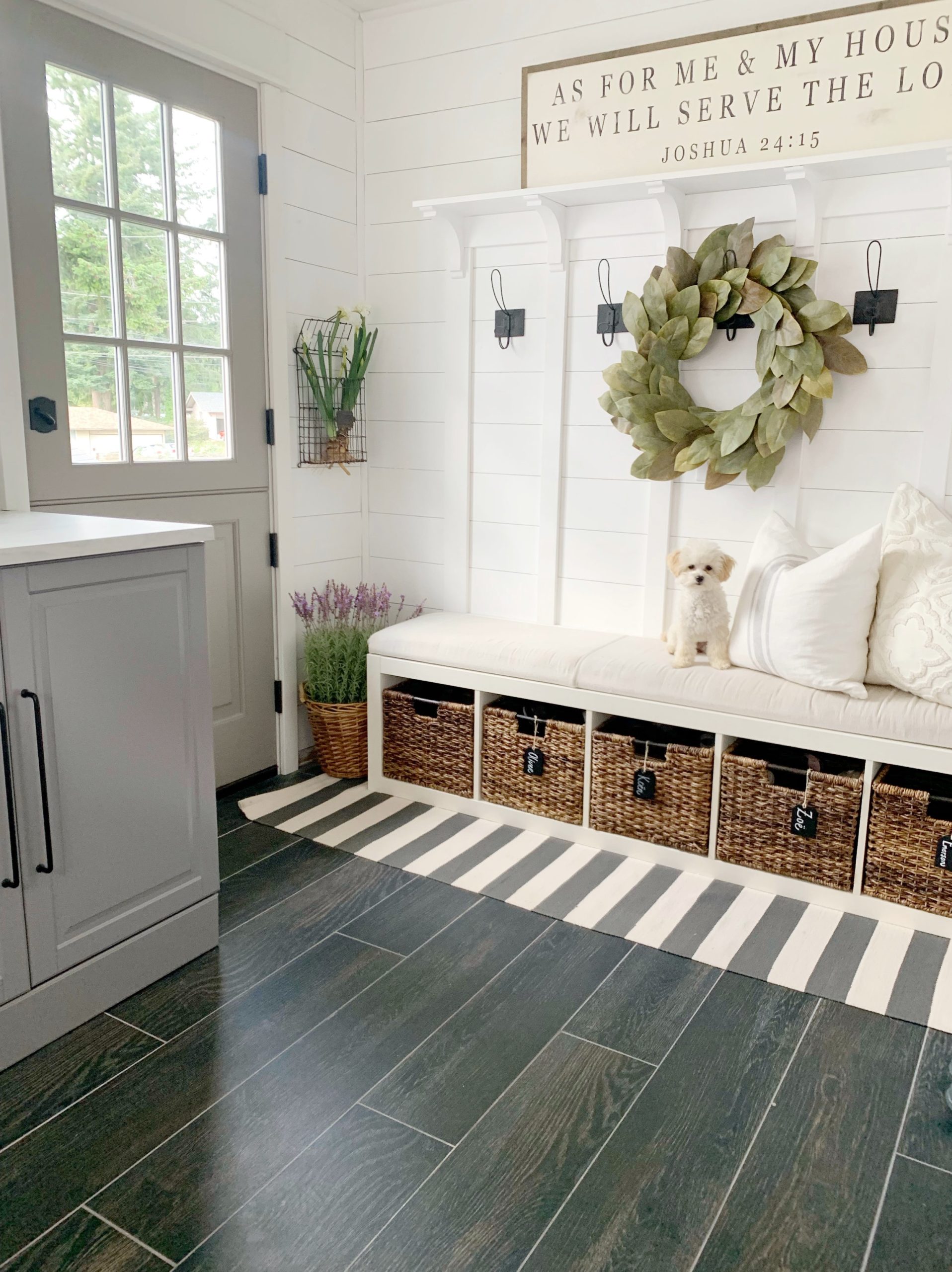 When my kids are home you will see the real – life view with their backpacks on the hooks… and during the school year the baskets are full of all their artwork and homework.