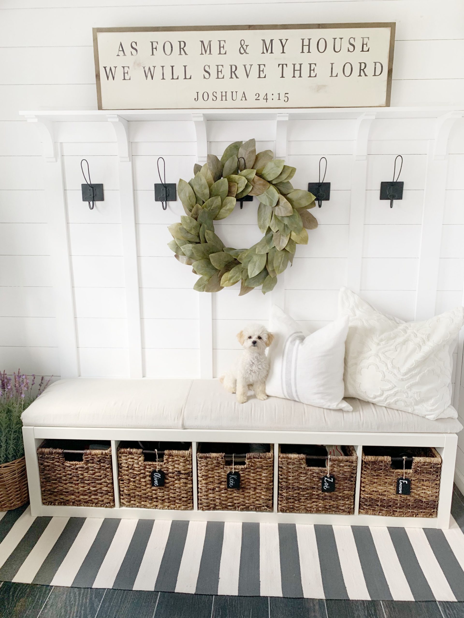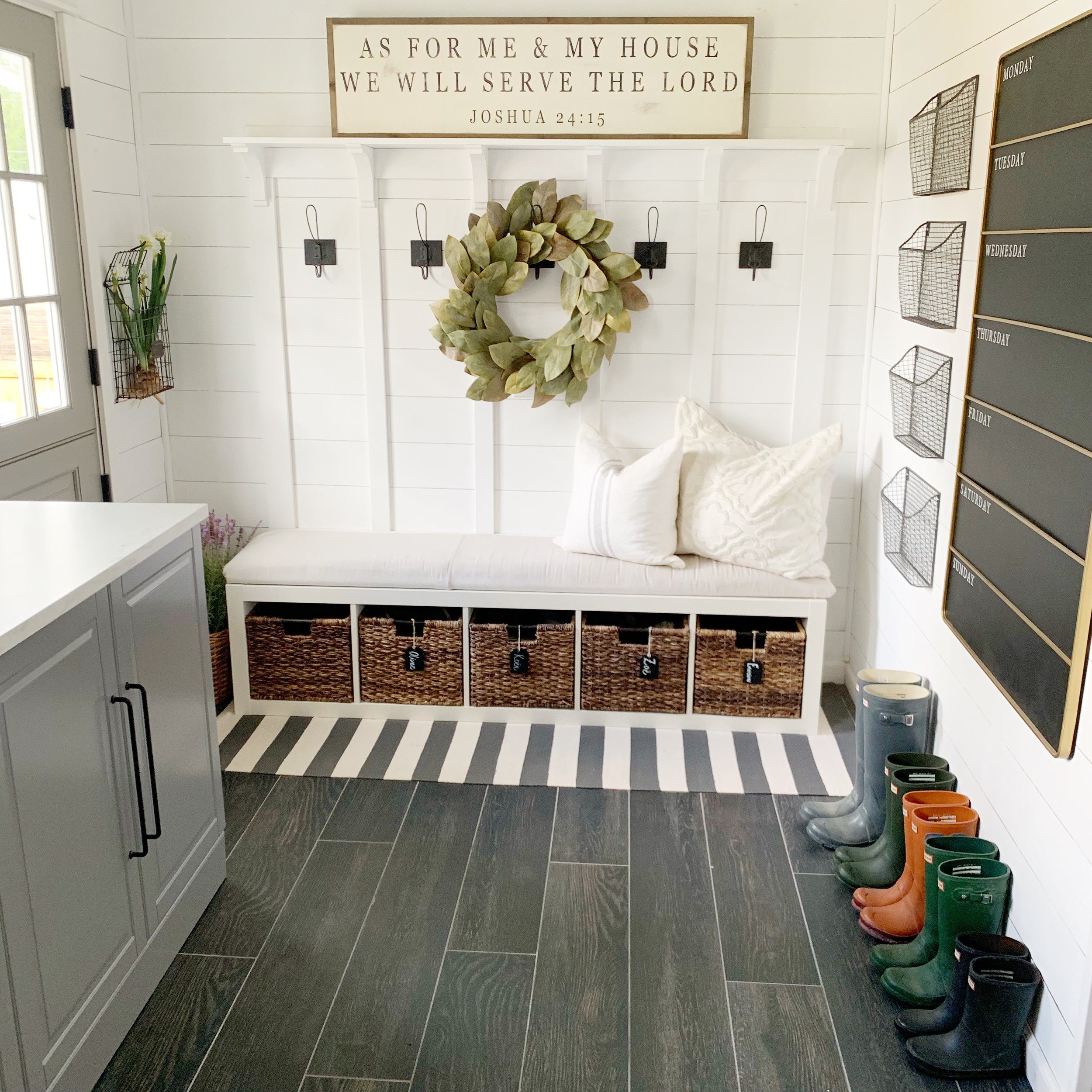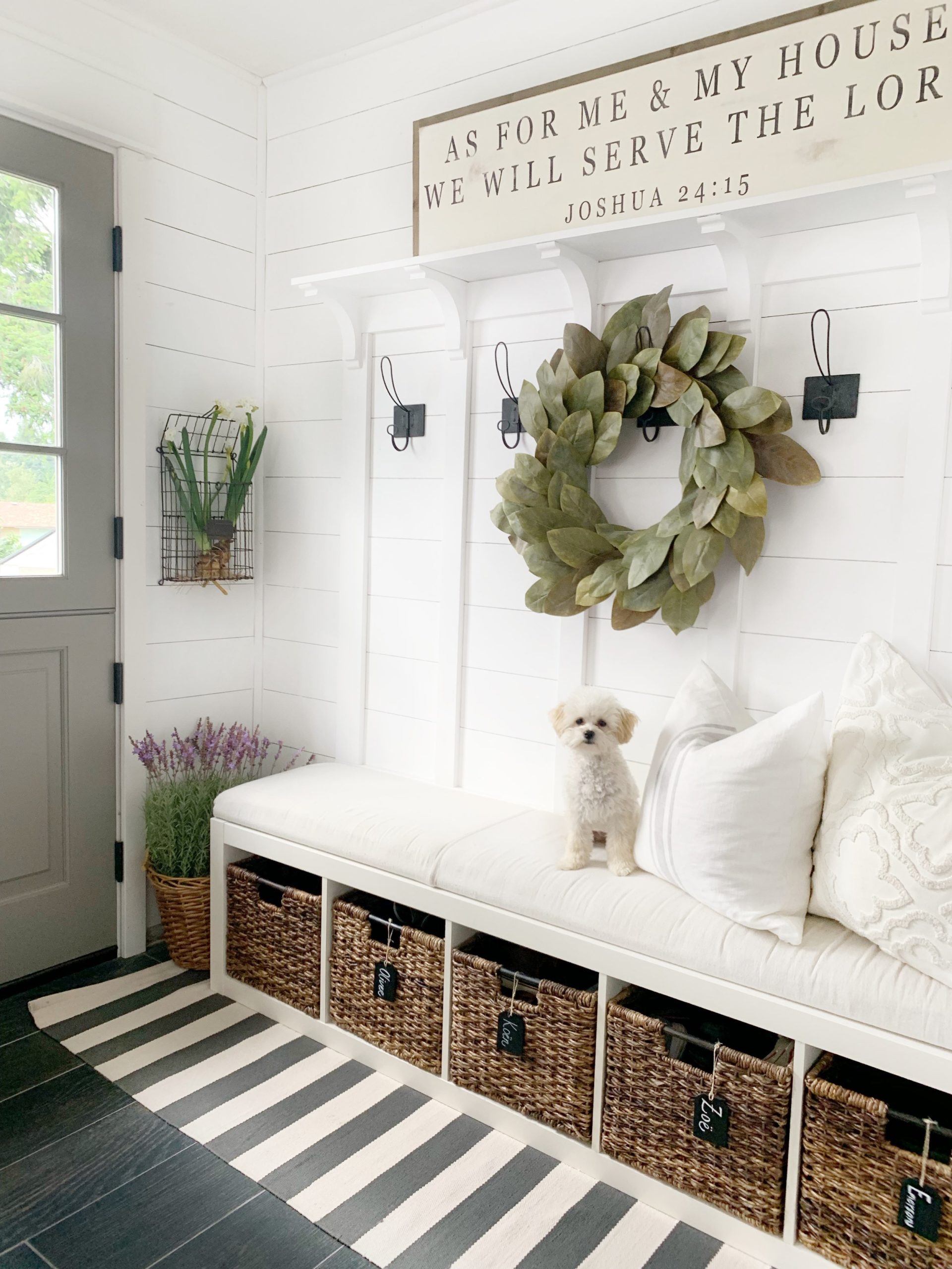 When my kids are home you will see the real – life view with their backpacks on the hooks… and during the school year the baskets are full of all their artwork and homework.