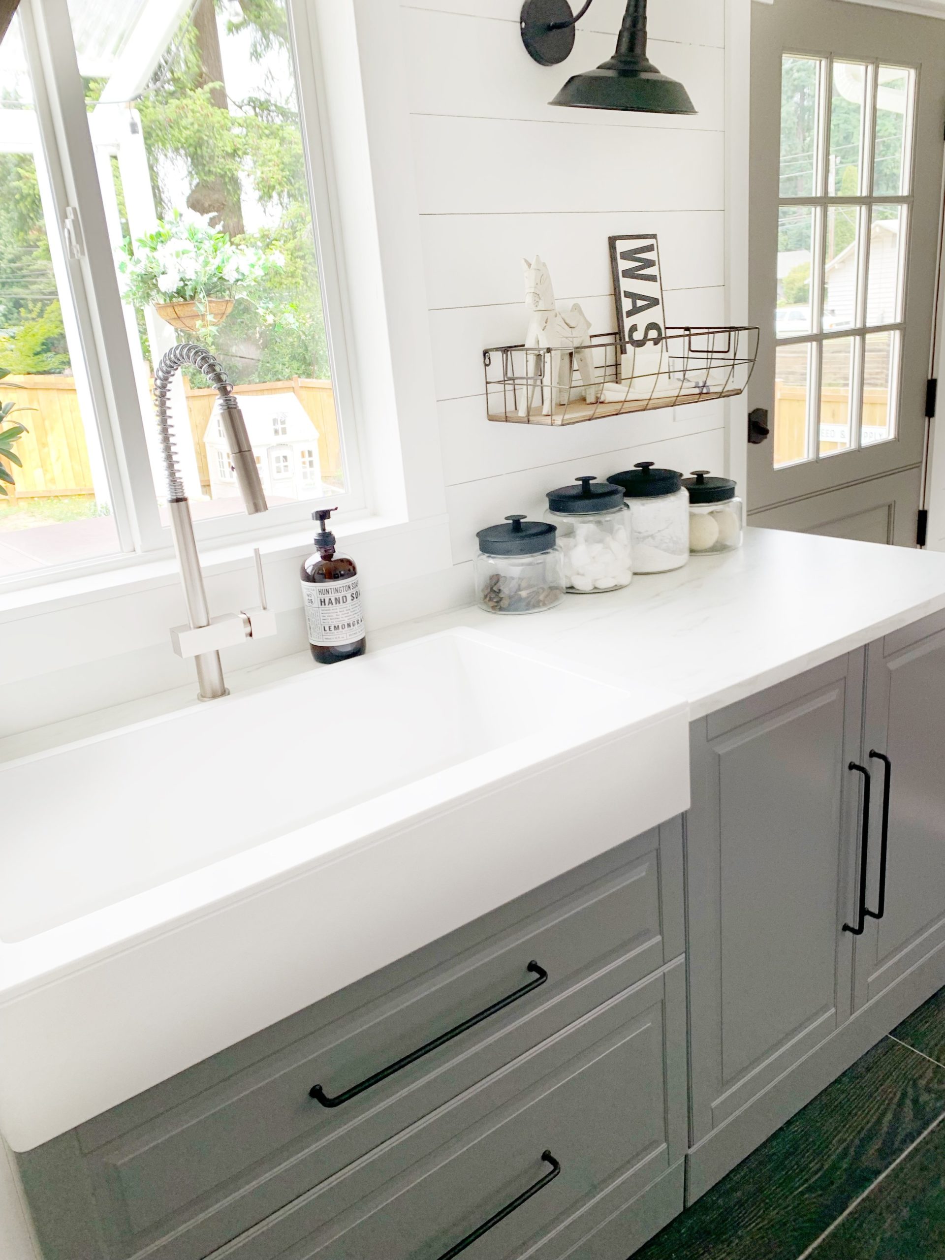 Let’s start off with this gorgeous Elkay Sink! I chose it not only because of the looks, but it is so durable and has the Perfect Drain, which means the drain is flush with the rest of the sink, so it doesn’t get gross like most other sink drains! I wish you could come on over and see it in person, it’s incredible and seriously the feel of the material is amazing! I also love the farmhouse apron.