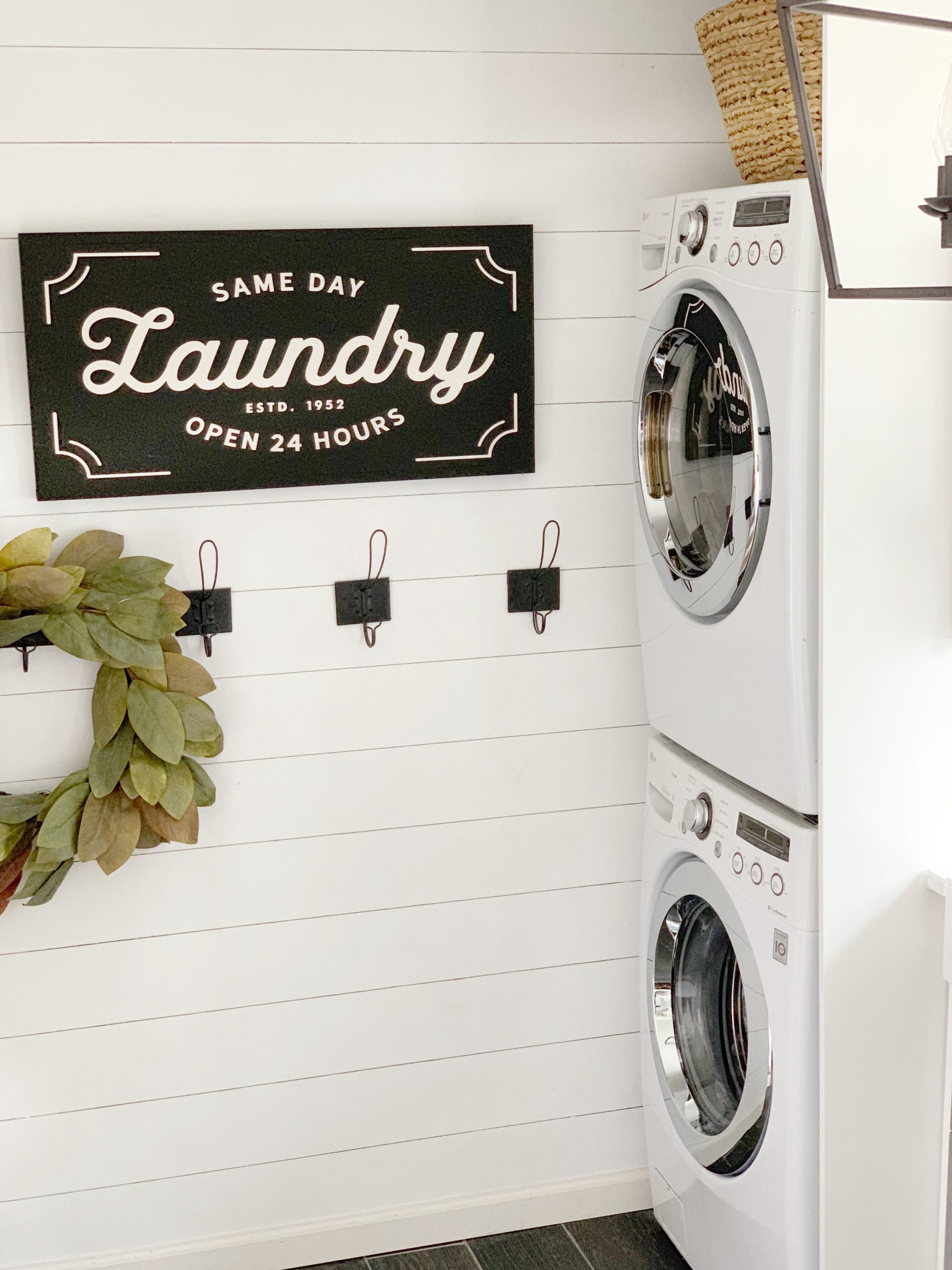 Stacking the washer and dryer was so easy to do! I know some people dislike front loaders, but we have had these for close to 5 years and have never had a problem … I told James that maybe we do laundry so much we never have to worry about them smelling?