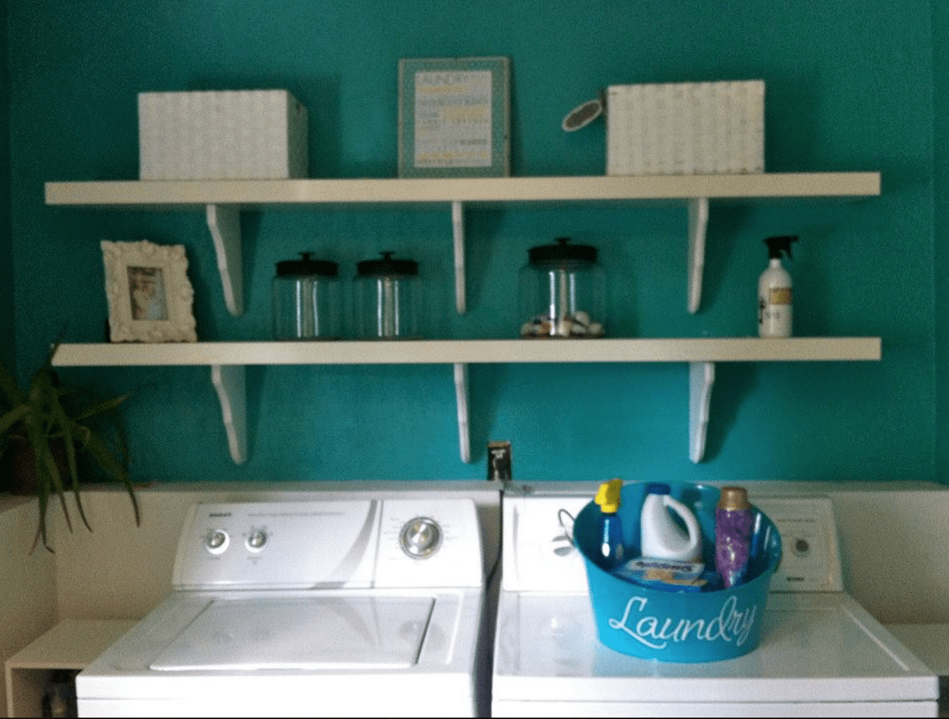 Directly in front of this view is our living room, and all you would see is curtains… which is better than seeing a washer and dryer, but it just didn’t feel like a separate space. That is where my grand idea came of redoing the laundry room. I had a few friends stack their washer and dryer and then I thought why didn’t I do that? Seriously best decision EVER! We have had them stacked about a month now, and we LOVE it!