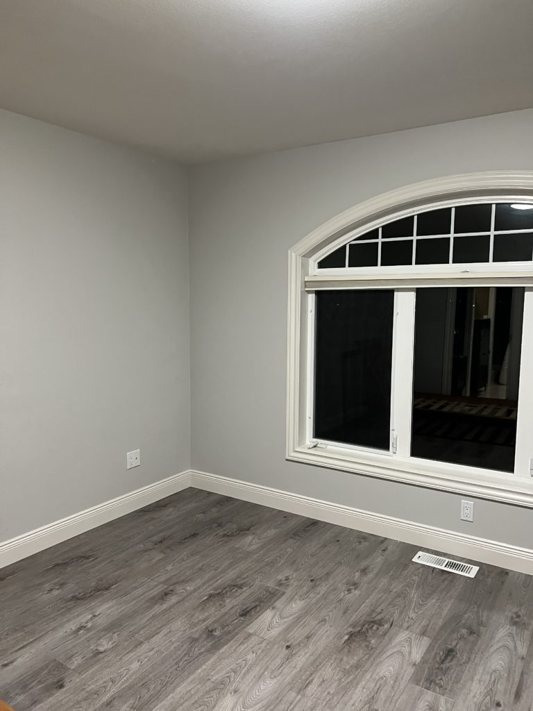 All painted, and this color from Benjamin Moore – Rainy afternoon is so GORGEOUS!!! Now let’s get to the flooring for the bedroom!