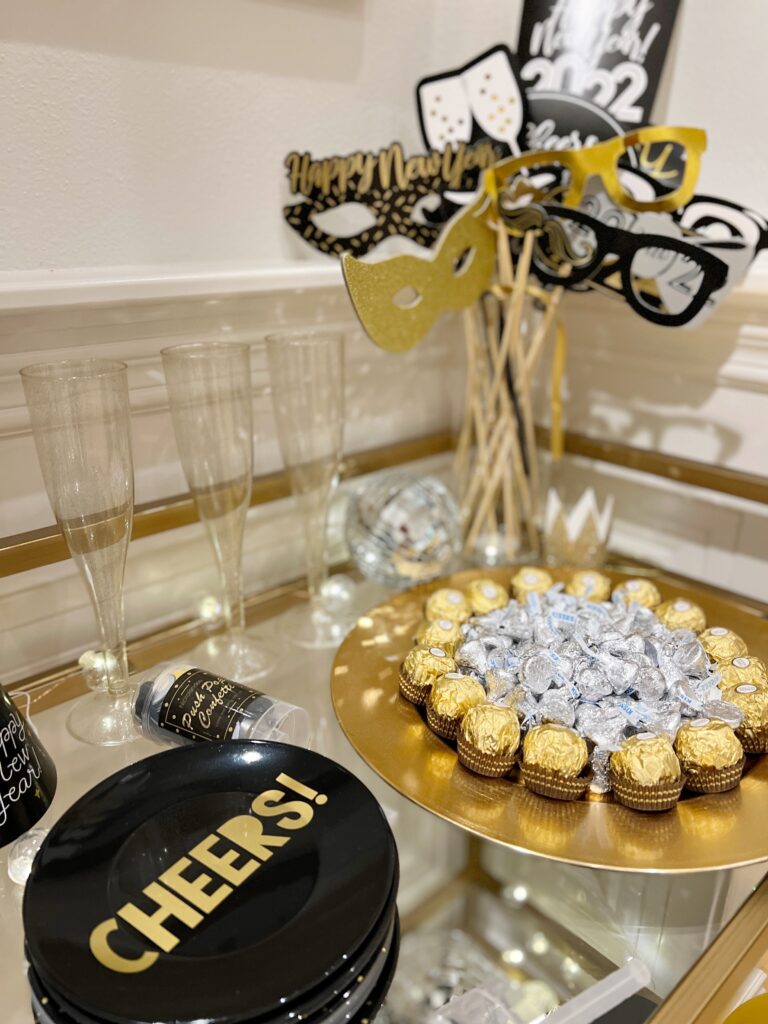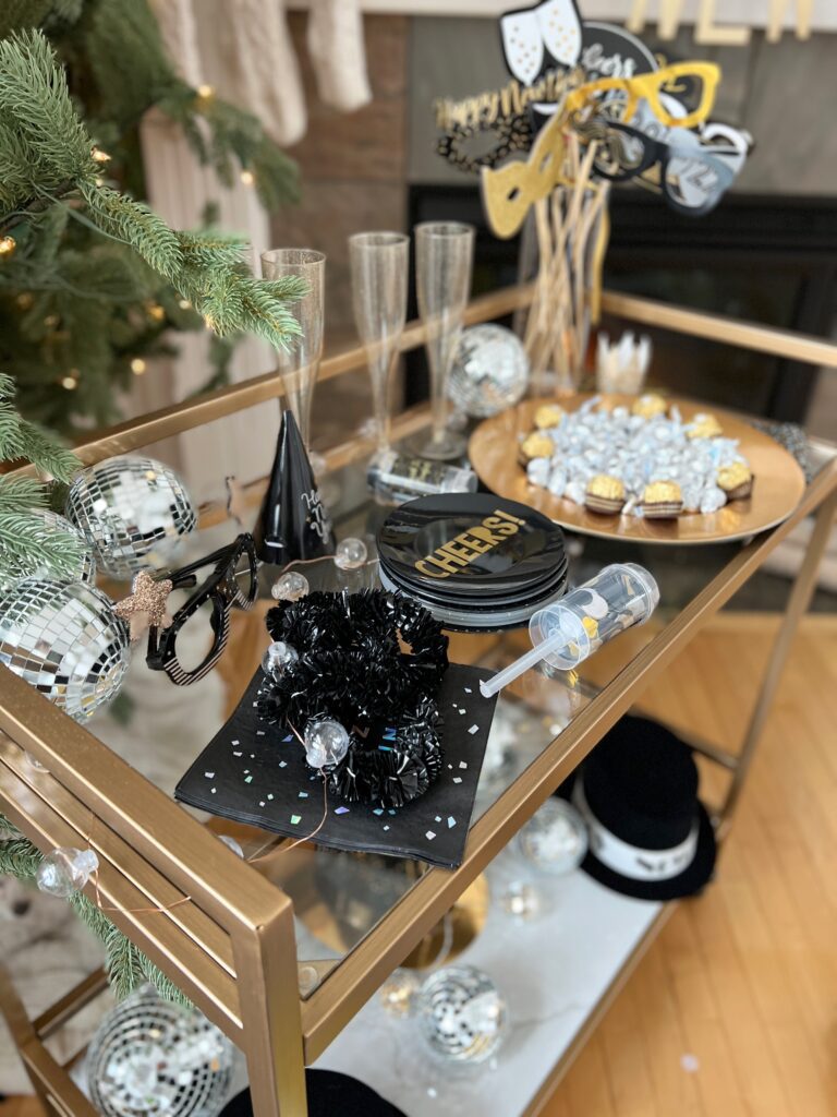 Grab some gold and silver candies and then get some fun drinks along with decor and your bar cart is set!
