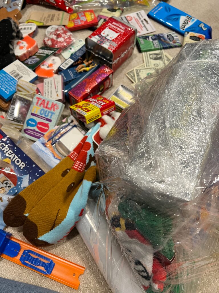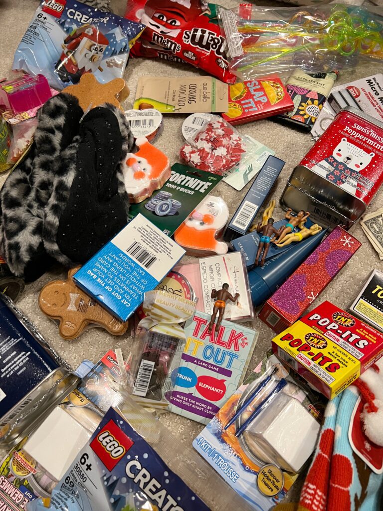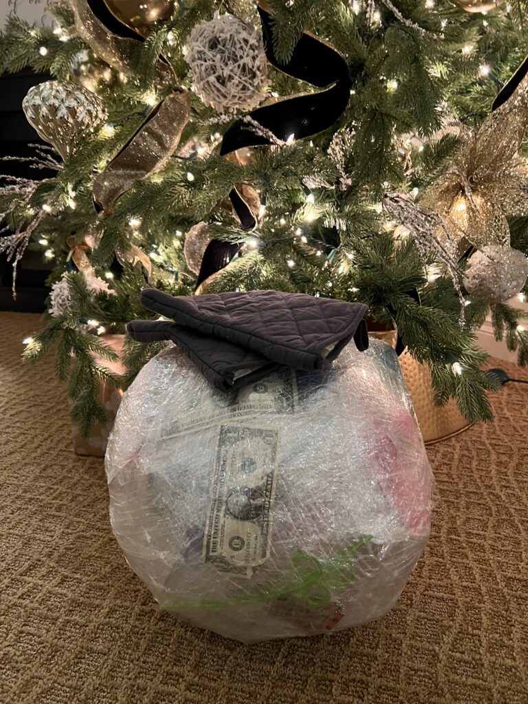 Pick a person to start, then they need to wear oven mitts. The person next to them on the left will start rolling dice. As soon as they get doubles – they yell doubles and take the ball. Whatever the person that had the mitts on unrolls gets to keep those prizes that fall out. You keep doing this round and round till it ends.