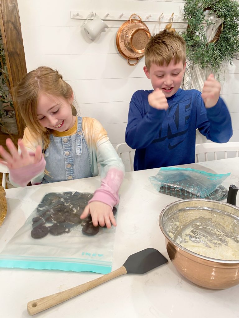 - Lets start with the oreos. If you put it in a food processor it will come out like a perfect dirt. We chose to have fun with it and placed it in bags and the kids went to town smooshing it.