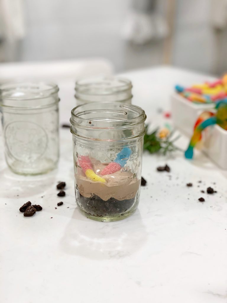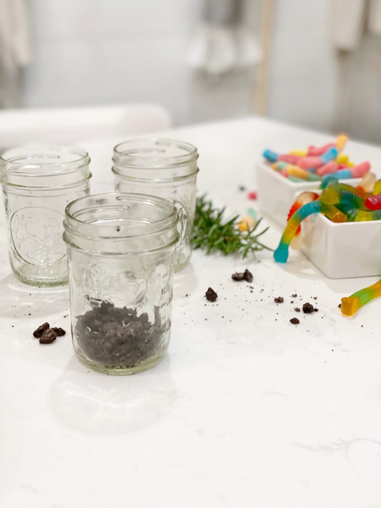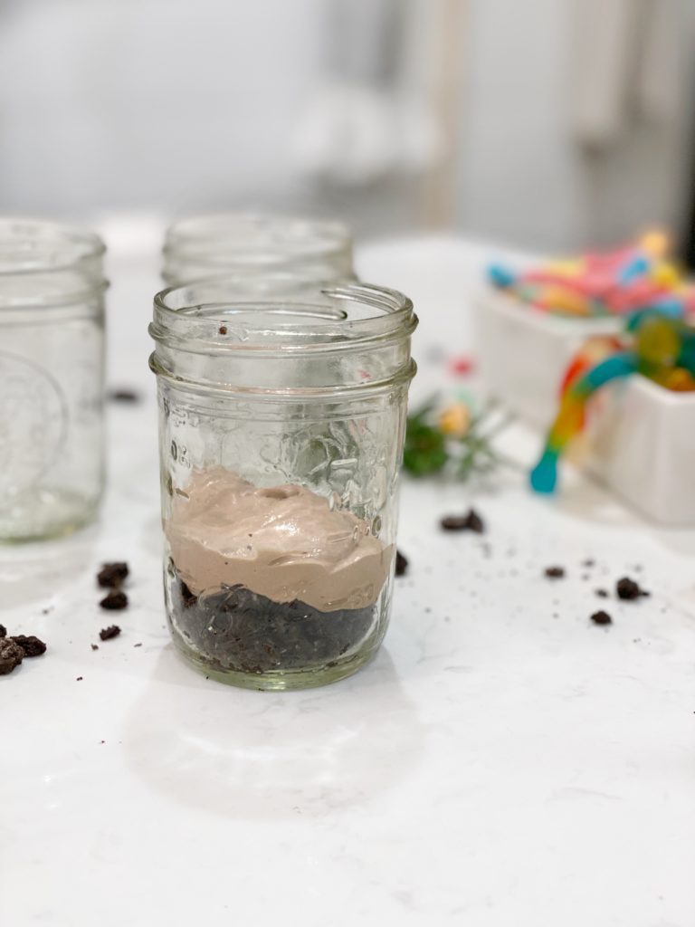 Since everything is prepped its time to prepare! You can start with whatever layer you would like, we start with the oreos, pudding then worms!