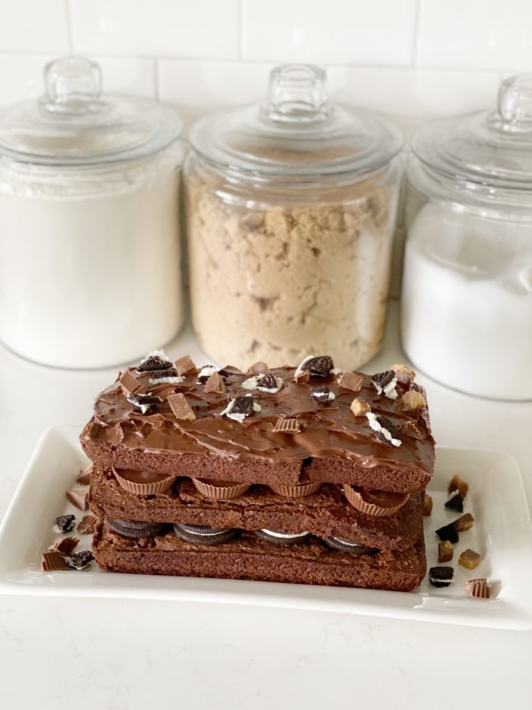 Ready for the best cake? Oreo Reese’s Peanut Butter Brownie Cake with everything you should have on hand if you love this stuff!