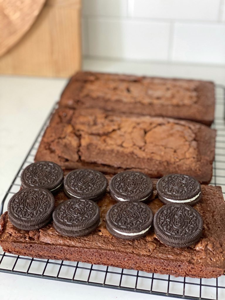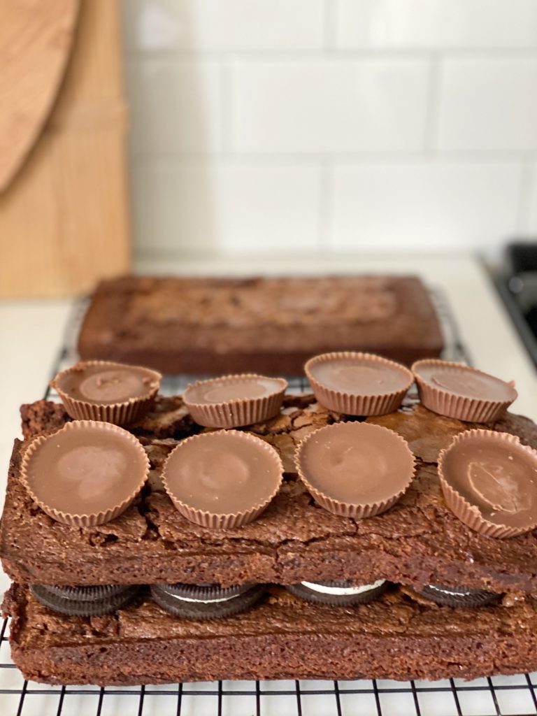 7. Once your brownies are cool it is time to put your Oreo Reese’s Peanut Butter Brownie Cake together.