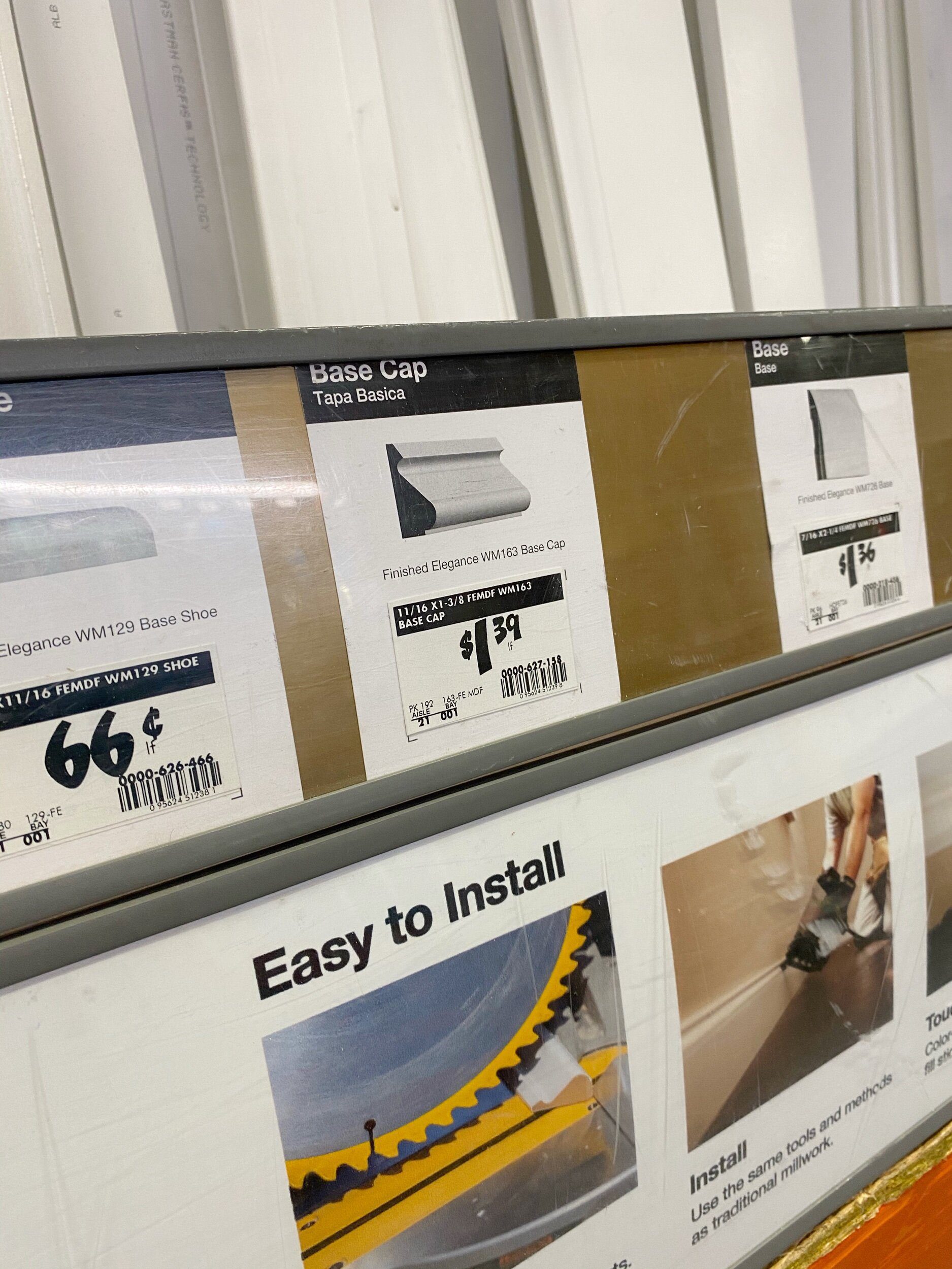 There are many types of trim you can use, we found this base cap at The Home Depot and it was just what we were looking for! We cut each piece and it was time to install!