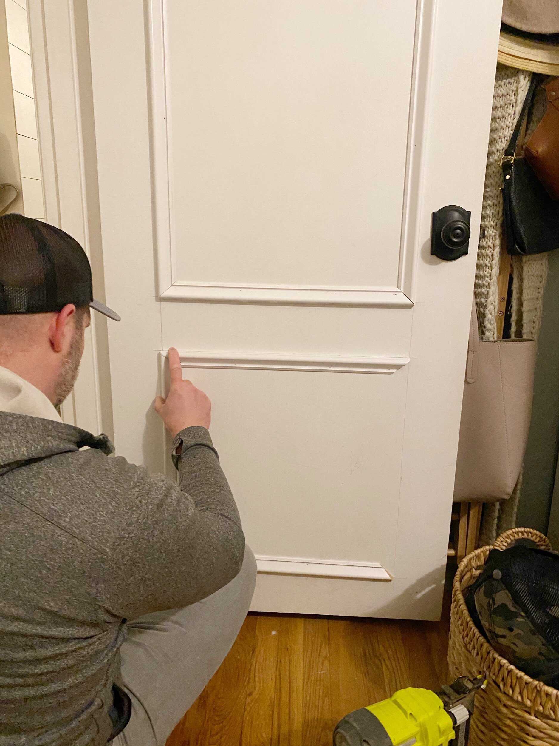 We found our supplies at The Home Depot – we used approx. 16 linear feet for each door, but we bought extra to make sure we had enough for all the doors we were working on. There are many ways to upgrade a door by adding trim, since this door sits on the inside of the door frame this was the only way for us to add trim without making major modifications.